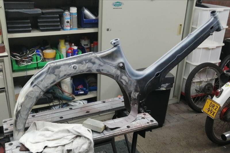 De gehele brommer uit elkaar gehaald. behalve de motor.