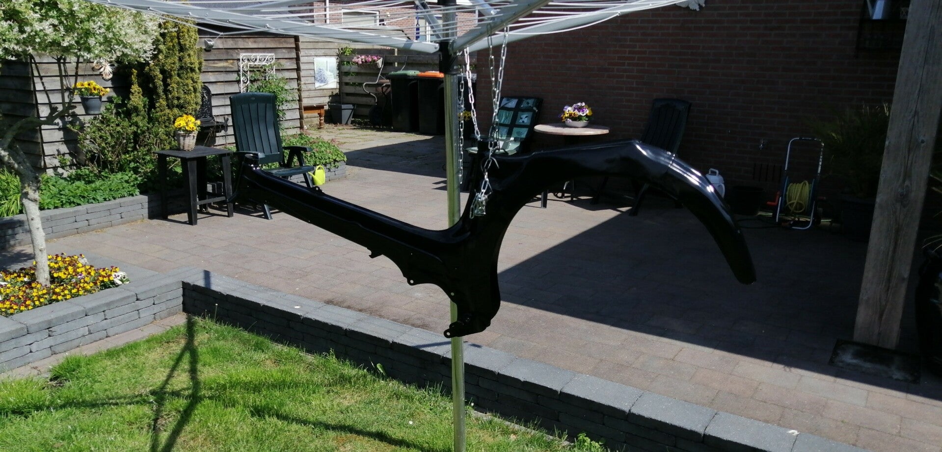 Lekker in de zon gespoten. Na enkele dagen drogen. Nogmaals ligt schuren en dan nog eens spuiten.