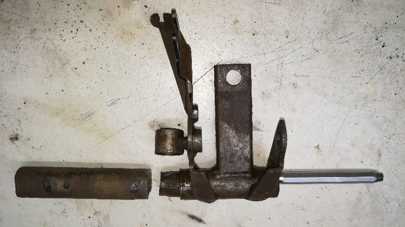 origineel is deze as een buis, met een soort spanbuis er binnenin, standaard is een as/buis van rond 25mm, Gemaakt van rond 24mm. hierdoor de nylon lagerbussen ook nieuw gemaakt.oude buis er af gezaagd, in de gleuf van de borgring. binnenbuis eruithalen, hier blijft ongeveer 20mm achter. vlakvijlen. daarna de houder verven of spuiten. na drogen de nieuwe as er in tikken. bij het maken van de as er rekening met houden dat het een lichte perspassing moet worden. eventueel op het voetpedaal een rubber plaatsen. het aanslagrubber heb ik vervangen door een nylon prop de werking is gelijk. na het monteren van de nylon bussen het pedaal passen op de as. als deze soepel kan bewegen, deze dan invetten en weer monteren. normale diameter van de as is 25mm maar als je een kleinere maat hebt zoals b.v.24mm de nylon bussen hierop aanpassen. zelfs 20mm is nog mogelijk. de nieuwe as er met een ligte perspassing in monteren